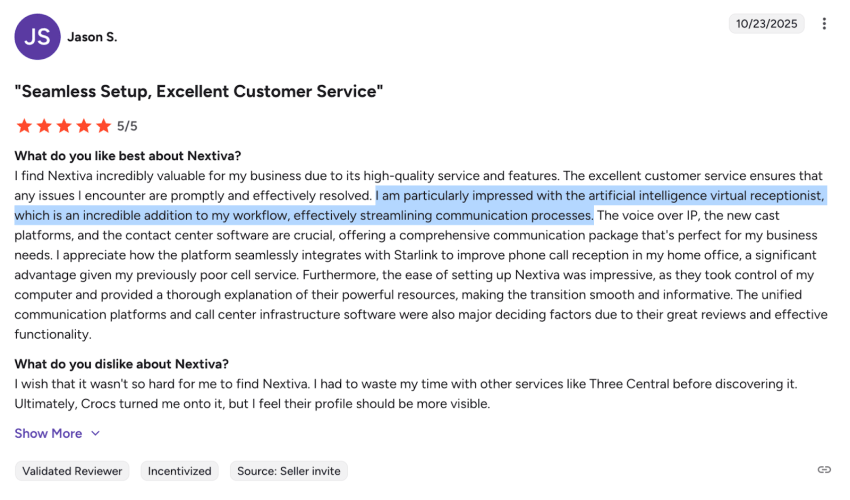 Users highlight the easy setup for those already in the Nextiva ecosystem. The transition is described as seamless, as the AI agent runs directly on existing business phone lines, so no number porting or provider change is required.