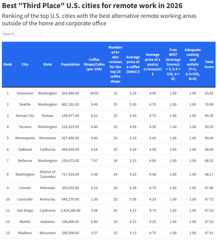 Rounding out the top 10 is Louisville, Kentucky, the 10th-best “third place” city for remote workers. With all of its top 25 shops rated four stars or better, Louisville’s café scene combines strong customer ratings with workspace features, which is ideal for remote professionals maintaining productivity outside the home office. The city’s coffee shops and cafés also balance quality and accessibility with affordability, as Louisville’s average price for a latte and pastry is among the 10 most affordable in the country at $5.05 and $4.33.