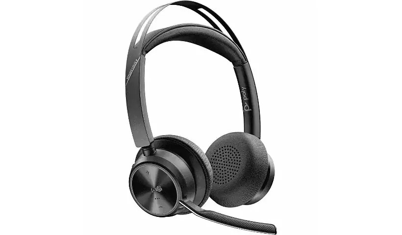 The Poly Voyager Focus 2 is a wireless stereo Bluetooth headset with advanced hybrid active noise cancellation and superior voice clarity, perfect even in noisy environments. It offers up to 19 hours of talk time, smart sensor technology for automatic call handling, and is ideal for all-day use with comfortable padded ear cushions.