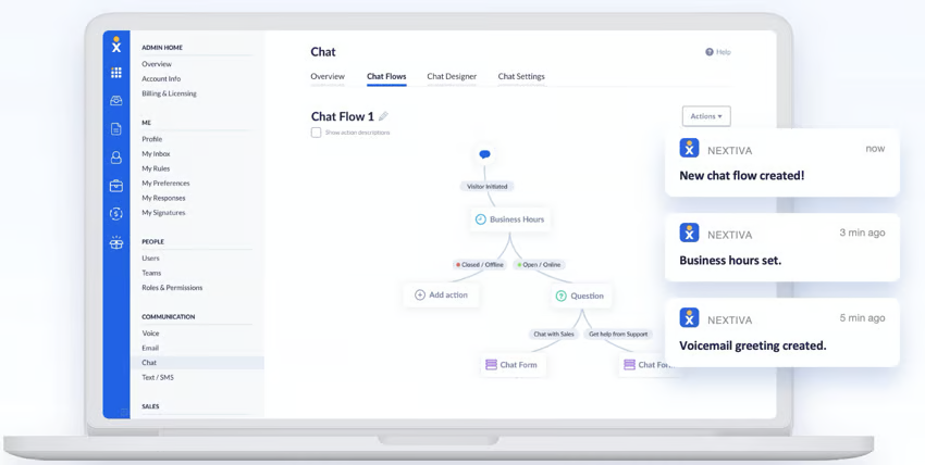 Nextiva makes it easier to build and manage call flows with cloud-based tools like drag-and-drop call flow design, custom IVR menus, business-hour routing, and skills-based routing. Plus, Nextiva provides real-time analytics, AI-powered call intelligence, and 99.999% uptime.