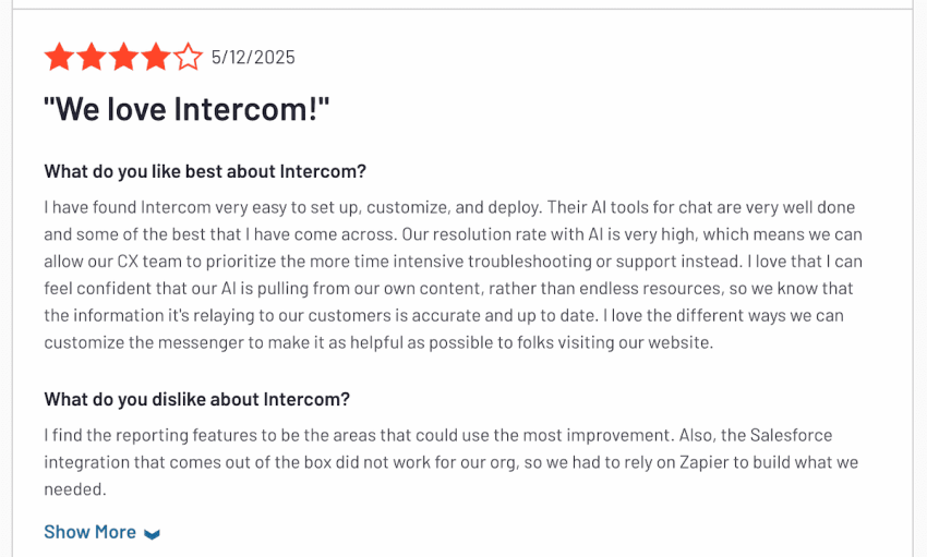 Intercom is an AI-focused customer engagement platform that excels in offering real-time support. It has a 4.5 rating and over 3,300 reviews on G2.