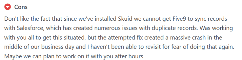 Dragging tickets and billing friction are two commonly reported negative experiences with Five9. However, customer service and CSR knowledge are well-lauded and appreciated by customers.