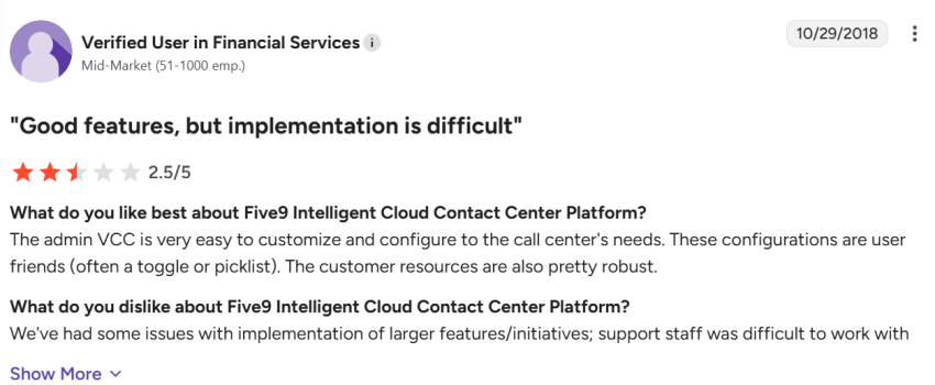 Customers highlight smooth onboarding when they have a dedicated technical account manager and clear escalation paths. Some reviews also praise responsive Five9 support and predictable implementation.