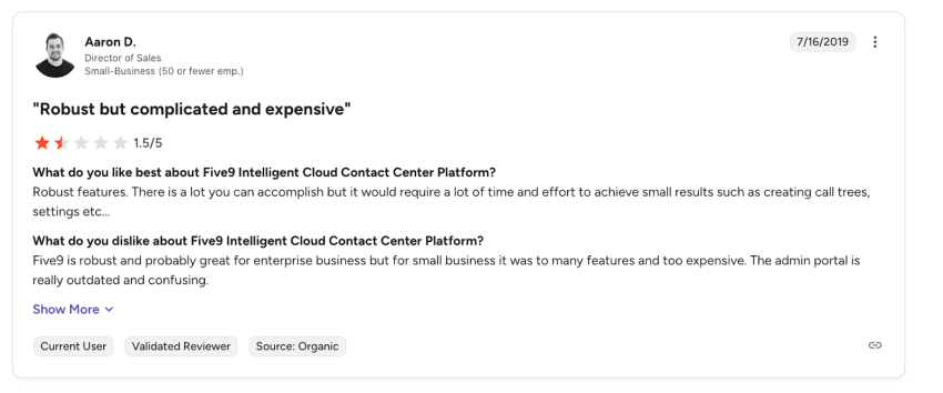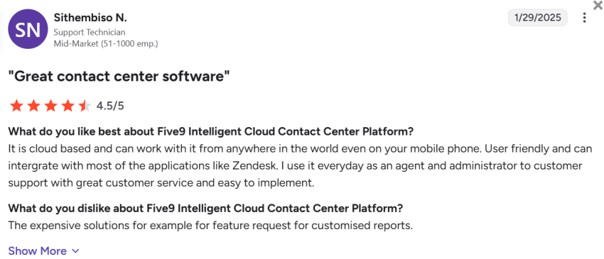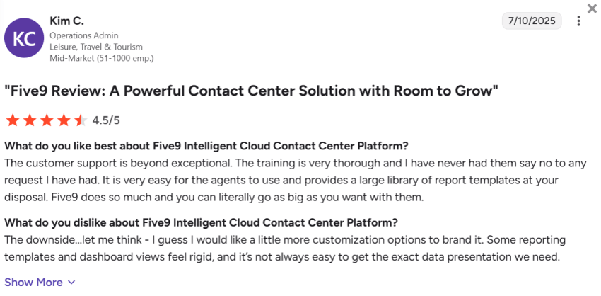 Five9 is proven at enterprise scale across geographies, with real-time status visibility and regional rollouts. However, reviewers note that the platform can be quite pricey for smaller brands and businesses, and only a limited number of sales team members can use the call center software, or else the server quickly gets bogged down. It’s also expensive to have more seats on board.