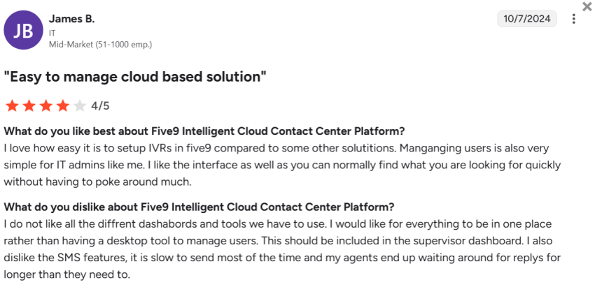 Enterprises with dedicated IT staff are generally able to manage Five9’s complexity. SMBs, however, may find the initial configuration (namely, interactive voice response design, skills, and customer relationship management sync, which come with a learning curve) time-intensive. Reviewers note the need for experienced admins or professional services in more advanced deployments.