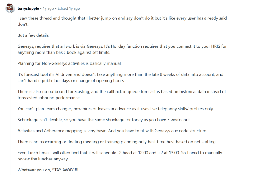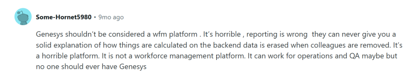 Genesys WFM still lacks flexibility compared with best-in-class vendors. It has been torn apart time and again by the r/workforcemanagement forum. While Reddit doesn’t lend itself to overly positive sentiment at the best of times, it is a forum where users can speak freely with peers in the same position.