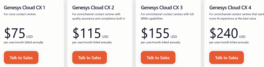 The Genesys pricing model is based on a per-agent subscription plus add-ons for WFM, analytics, and AI functionality. It comes in at the higher end compared with other market leaders.