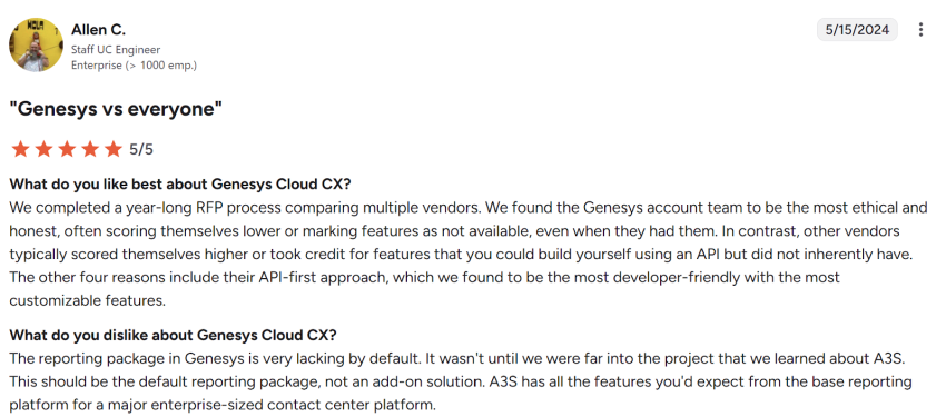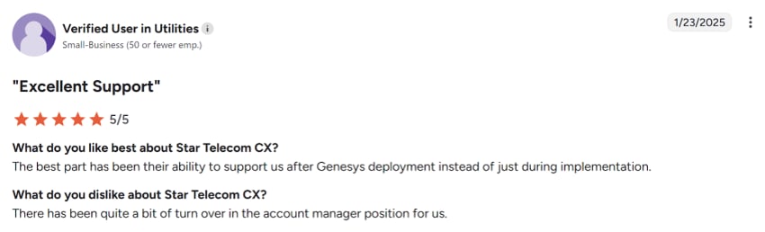 Star Telecom, for example, gets high praise for a sub-50-seat deployment despite its high turnover of account managers. This is something out of Genesys’ control — but it is something to consider if you value a personal relationship with your contact center provider.