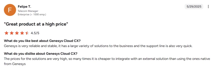 Genesys is consistently highlighted as expensive, especially for smaller organizations. One partner, in fact, publicly flags Genesys’ cost structure as a major dislike: