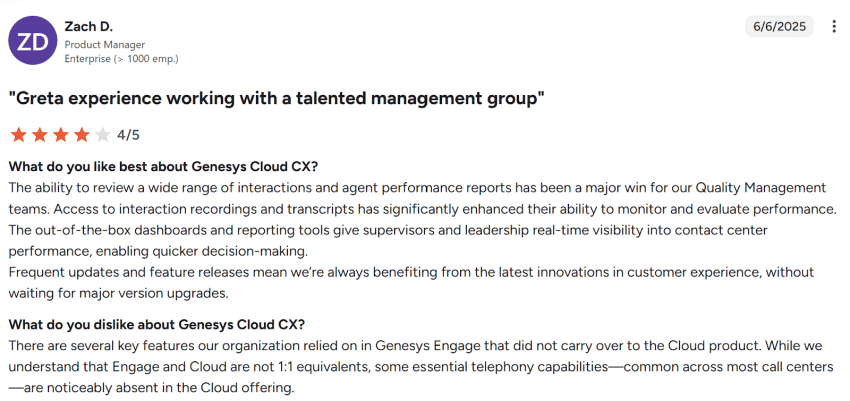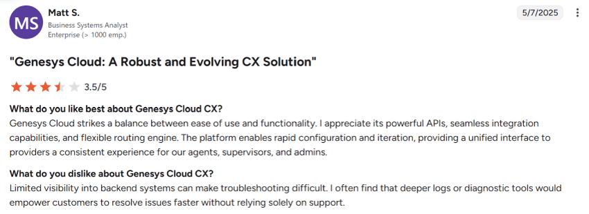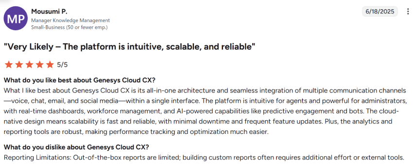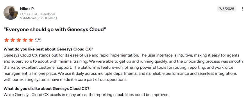 According to multiple Genesys reviews from actual useres, Genesys Cloud CX is a powerful platform that’s best suited for enterprises requiring scalability, compliance, and reliability.