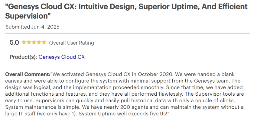 Since Genesys specializes in extremely large deployments, you’d expect high availability and uptime. And that’s exactly what the real-world reviews say.