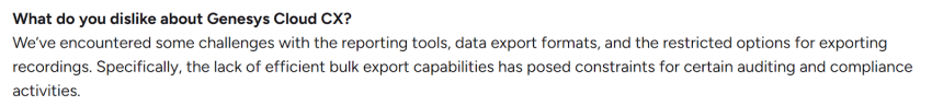 “There are several key features our organization relied on in Genesys Engage that did not carry over to the Cloud product. While we understand that Engage and Cloud are not 1:1 equivalents, some essential telephony capabilities — common across most call centers — are noticeably absent in the Cloud offering.”