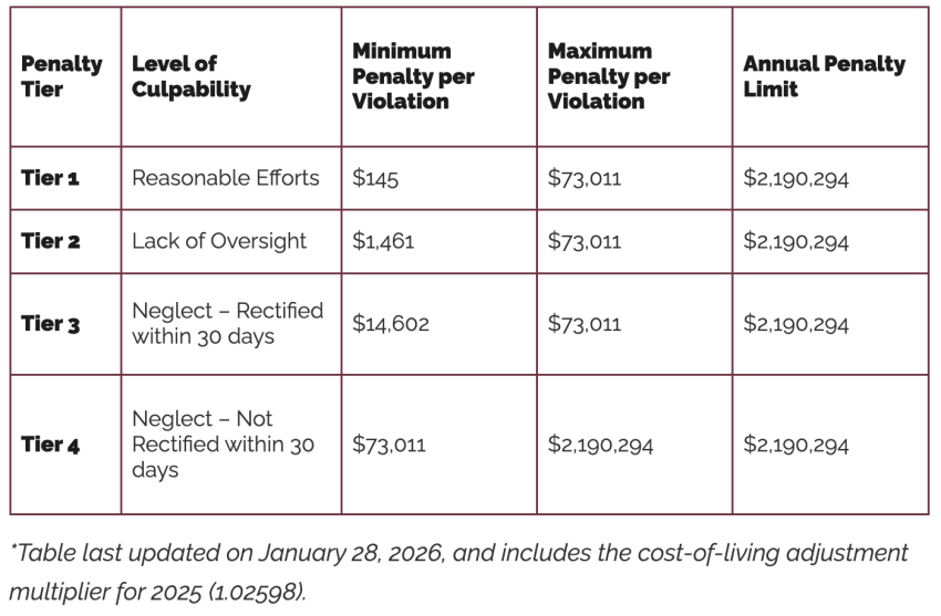 HIPAA violations come with hefty penalties. The HIPAA Journal provides an overview of the current HIPAA penalty structure, which is divided into four tiers. Tier 4 penalties are for violations due to willful neglect. The U.S. Department of Health and Human Services (HHS) adjusts HIPAA penalties for inflation annually. Even unintentional mistakes come with fines up to $73,011 per violation, highlighting the importance of having HIPAA-compliant data-handling protocols from the beginning.