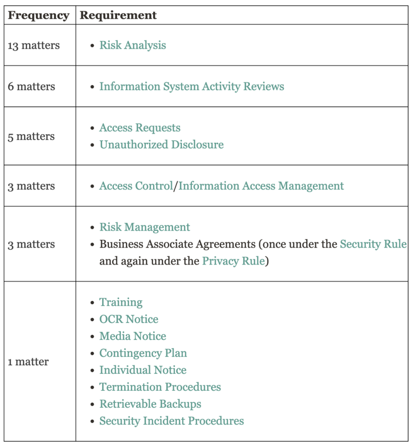 Data on resolution agreements from the HHS in a March 2025 report by the law firm Shook, Hardy & Bacon, shows that violations frequently stem from: