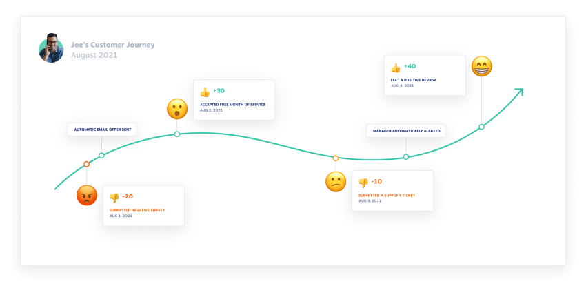 Exceptional customer service feels like it happens right before you need it. But it’s impossible to manually monitor every customer interaction and jump in at the right time. However, you’re constantly gathering data about your customer from interactions, surveys, and feedback forms. All this data creates a customer journey, a map of their current feelings about your company and brand.