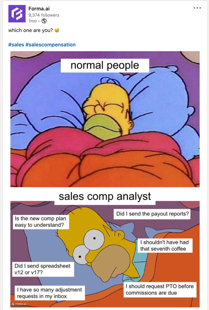 Take this Forma post that resonates with the emotional desires of their ideal customer. A well-crafted meme that relates to your business and uses humor to make its point is a win-win for everyone involved.