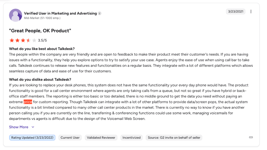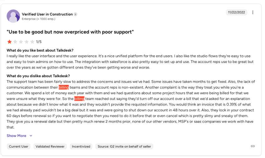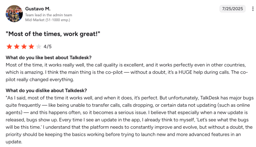 While Talkdesk offers a range of features that users find useful, some reviews note issues with certain aspects of the platform. Several G2 user reviews and Gartner Peer Insights reviews highlight challenges with how Talkdesk handles customer concerns, as well as inconsistencies in the platform’s performance.