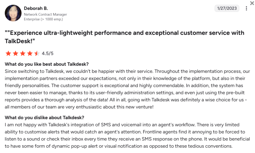 Many users describe Talkdesk’s customer support and helpdesk teams as knowledgeable and responsive. Support staff are noted for addressing issues efficiently and providing guidance to help team members navigate the platform.