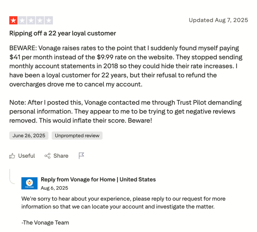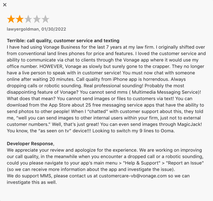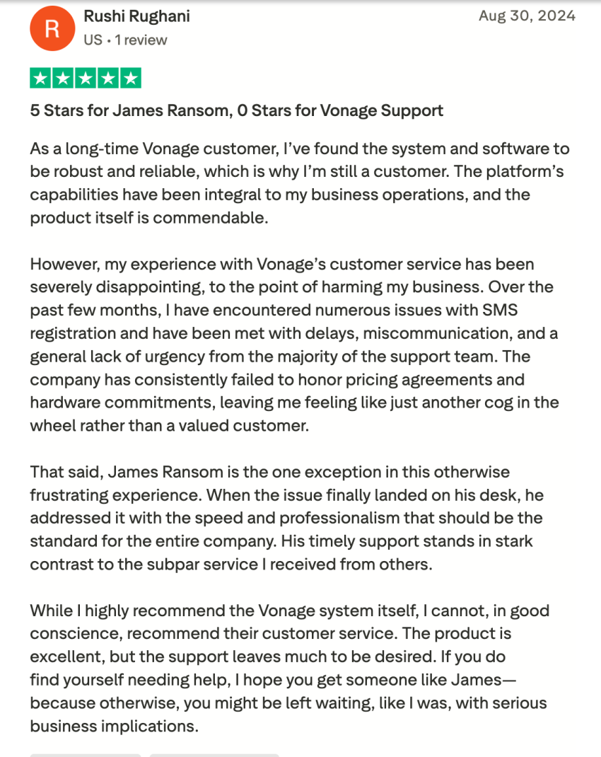 On TrustPilot, some have rated five stars for a particular support person while giving zero stars for Vonage support.