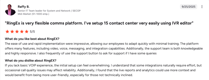 - Rich feature set and integrations: Leveraging features such as IVR editors, extensions, call routing, and many CRM or productivity tool integrations is a plus. The AI/RingSense capabilities also receive attention.