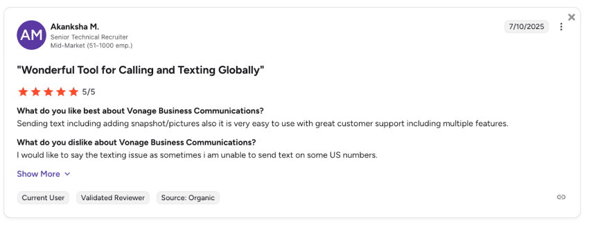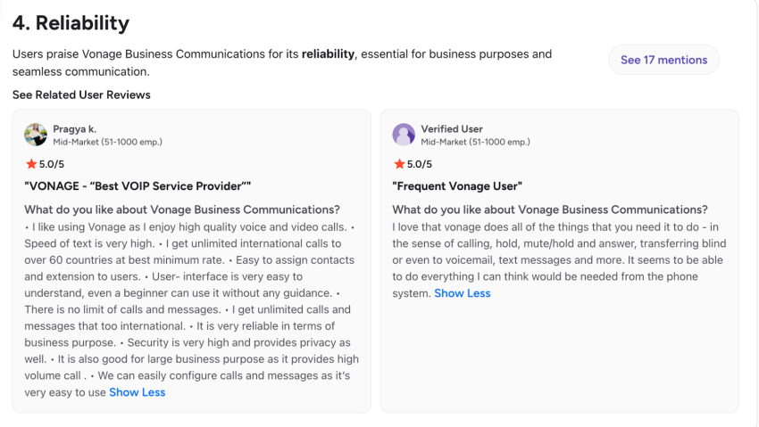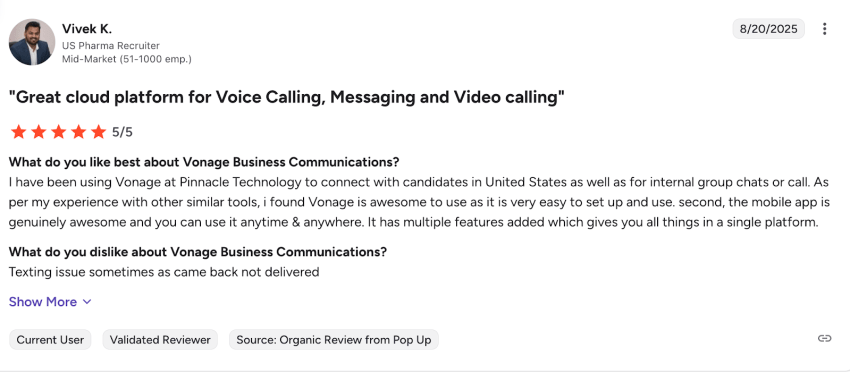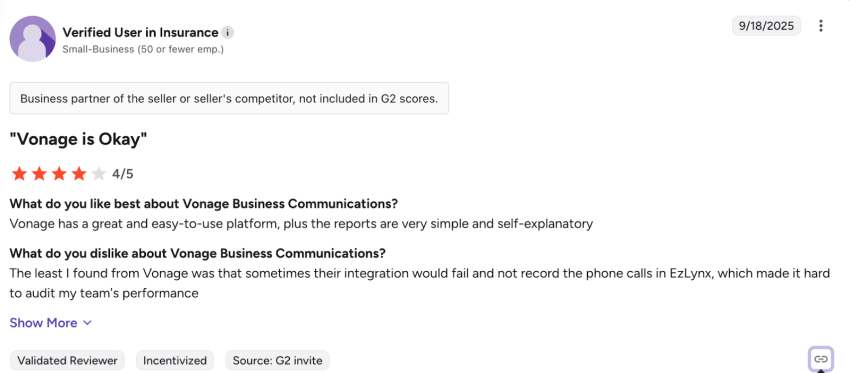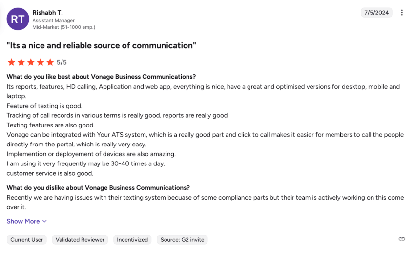 Multiple G2 reviews cite Vonage Business Communication as a generally reliable solution.