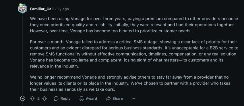According to G2 reviews, Vonage reporting tends to be functional but not advanced. Users compare it unfavorably to platforms that offer dashboards with deeper analytics, visualizations, AI insights, trend predictions, or drill-down capabilities.