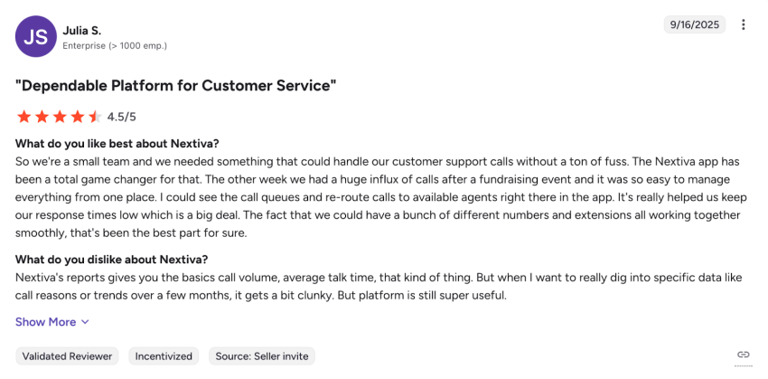 Here’s what Nextiva users frequently mention in their reviews on platforms like G2: