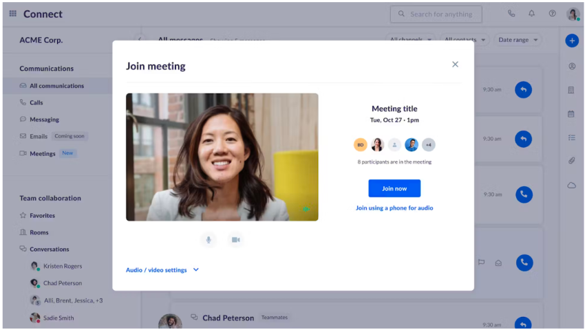 Callers enjoy crystal-clear audioconferencing and seamless content sharing in a virtual meeting.