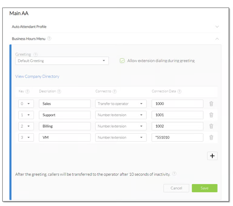 An auto attendant greets incoming callers with a professional recorded message and presents menu options that route them to the right department or individual without a live receptionist. For small businesses in particular, a well-configured auto attendant creates an immediate impression of professionalism and ensures callers reach the right destination even during busy periods or outside business hours.