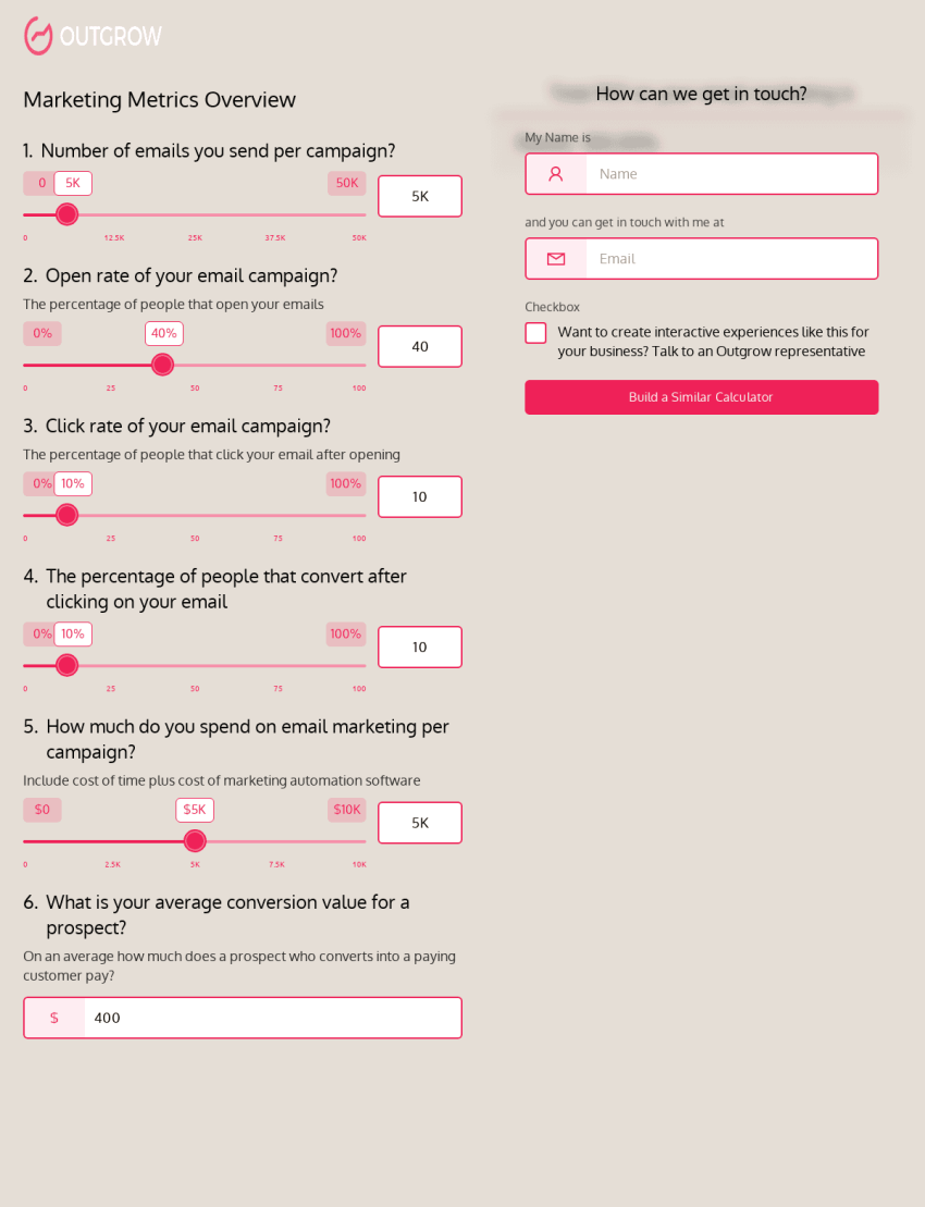 Outgrow is a tool that lets you create interactive content such as quizzes, calculators, and assessments that capture attention and generate leads. Its simple, no-code tools make it easy to create complex calculators and other content without having to hire developers.