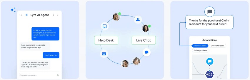 Tidio is an all-in-one customer service platform that uses AI to help small- and mid-sized companies respond to customers around the clock. Its plug-and-play setup integrates easily with most CMS and e-commerce platforms, and it combines live chat, AI chatbots (“Lyro AI), chatbot automation workflows, a help desk, and lead generation tools.